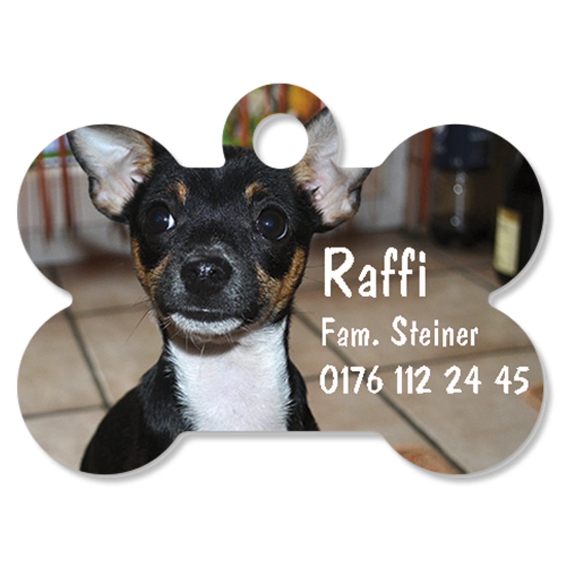 Der Anhänger bietet dir viel Platz um deine individuelle Botschaft aufzudrucken. Der Aluminium-Anhänger in Knochenform ist eine sehr nützliche Ausstattung für das Hundehalsband, denn Du kannst den Hundename und Adresse deines Vierbeiners aufdrucken oder einfach zum Spass mit einem lustigen Foto versehen. Du kannst ihn einseitig bedrucken und er hat bereits eine Lochung, damit du ihn mit der Metallöse gleich sicher am Halsband befestigen kannst.