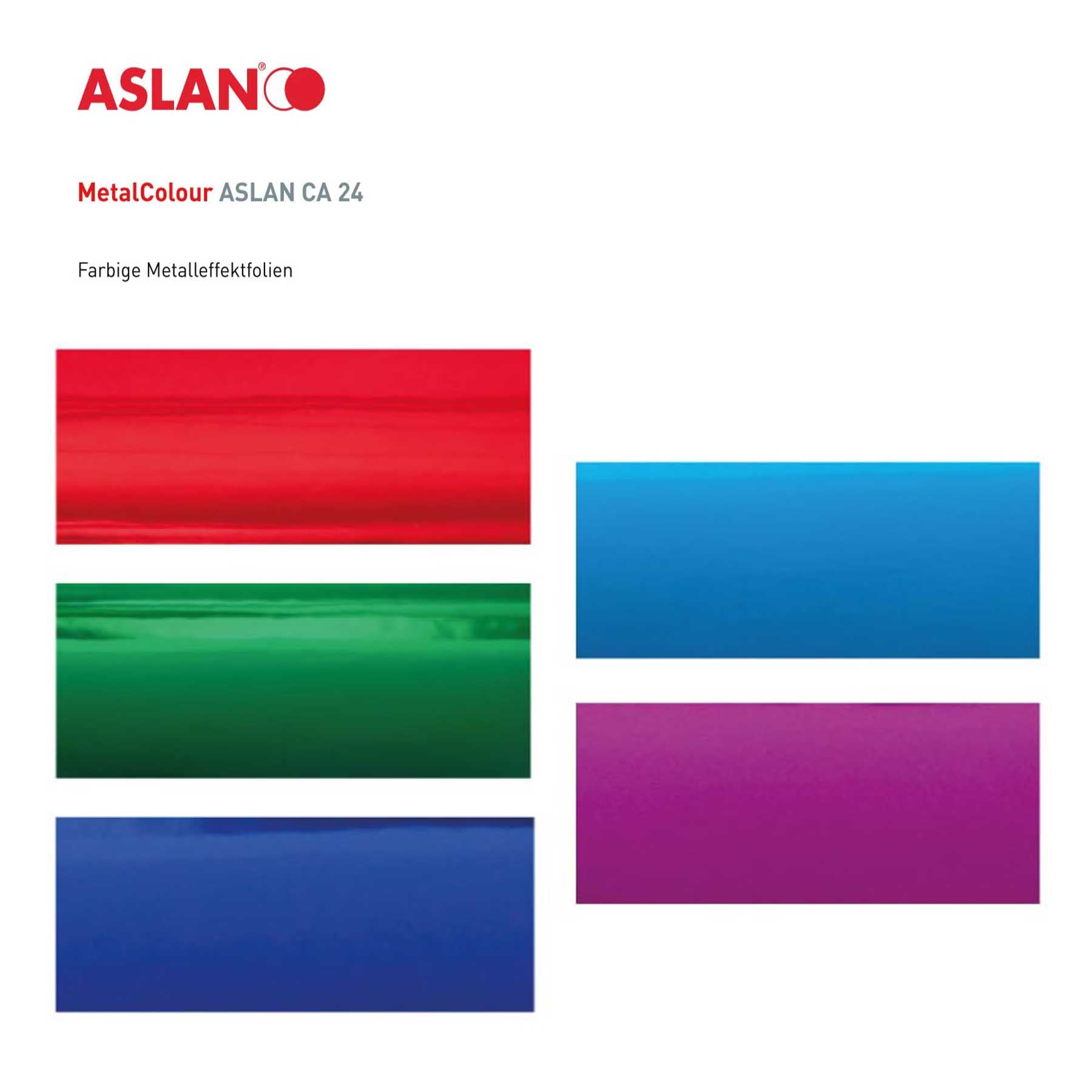 Mit der ASLAN MetalColour CA 24 Plotterfolie erstellst du traumhafte Designs in hochglänzenden Metalleffekten. Die ASLAN MetalColour CA 24 verfügt über fünf ansprechende Metallicfarbtöne mit denen sich exklusive Designs in farbiger Metalloptik für Innen und Aussen umsetzen lassen. Die ASLAN MetalColour CA 24 Plotterfolie kann mit jedem marktüblichen Schneideplotter verarbeitet werden. Verwende die Plotterfolie zum Erstellen von geplotteten Schriftzügen, Logos und Motiven sowie die vollflächige Dekoration von Schildern, Glasflächen und anderen glatten Oberflächen.