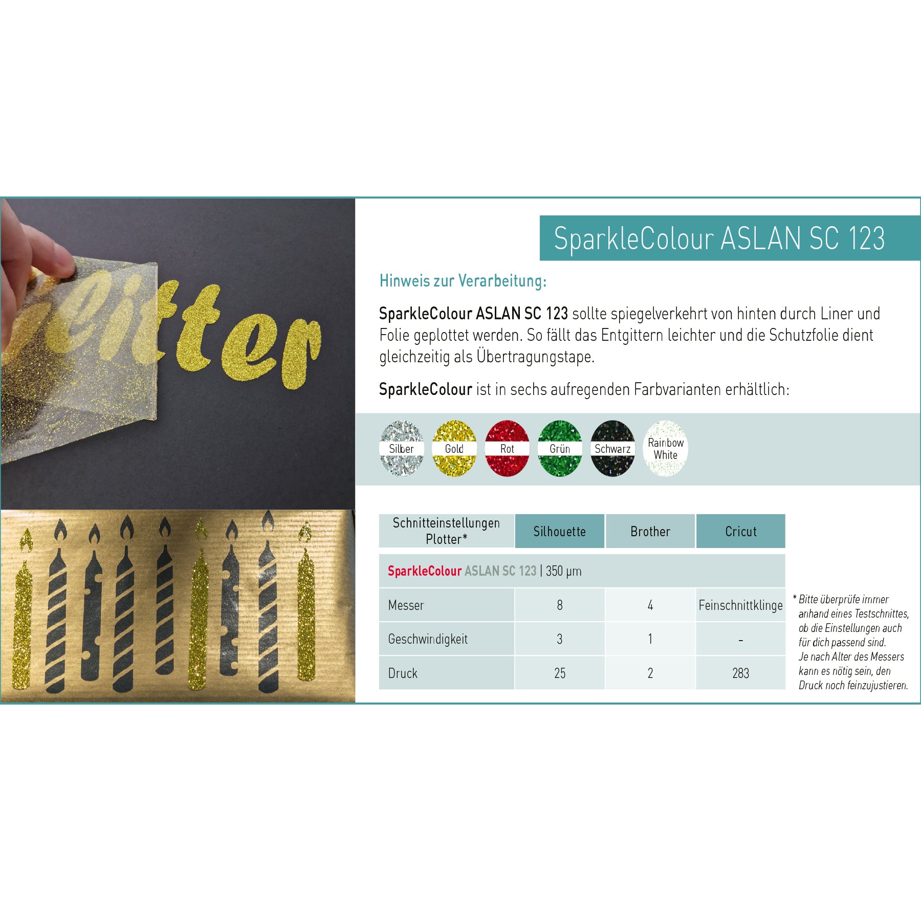 - Dicke: Effektfolie (PET + Liner): ~ 350 µm | Schutzfolie: ~ 100 µm