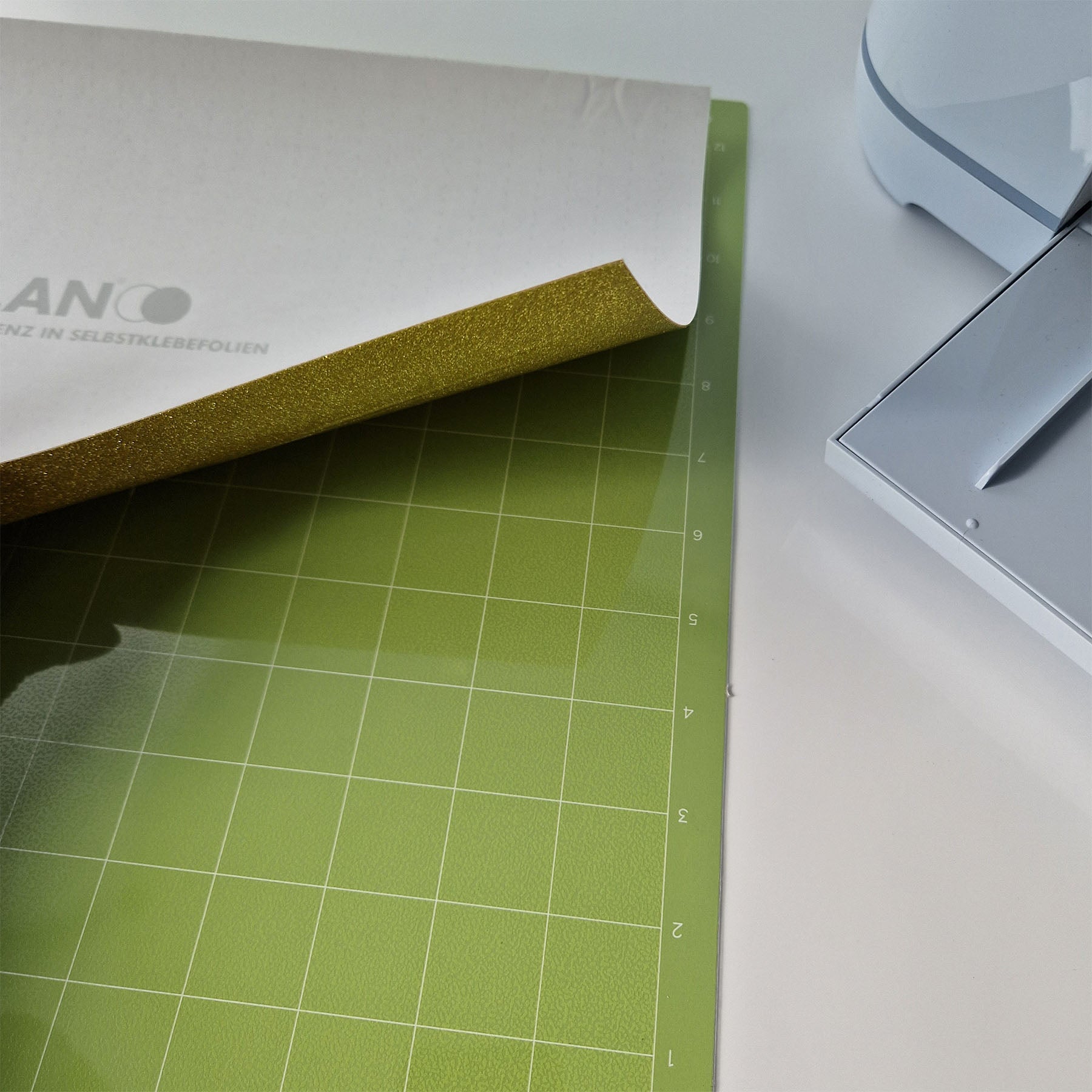 - Glitzerseite auf die Matte legen, da die Folie rückseitig durch den Liner geschnitten wird (Trägerpapier vorher NICHT abziehen)