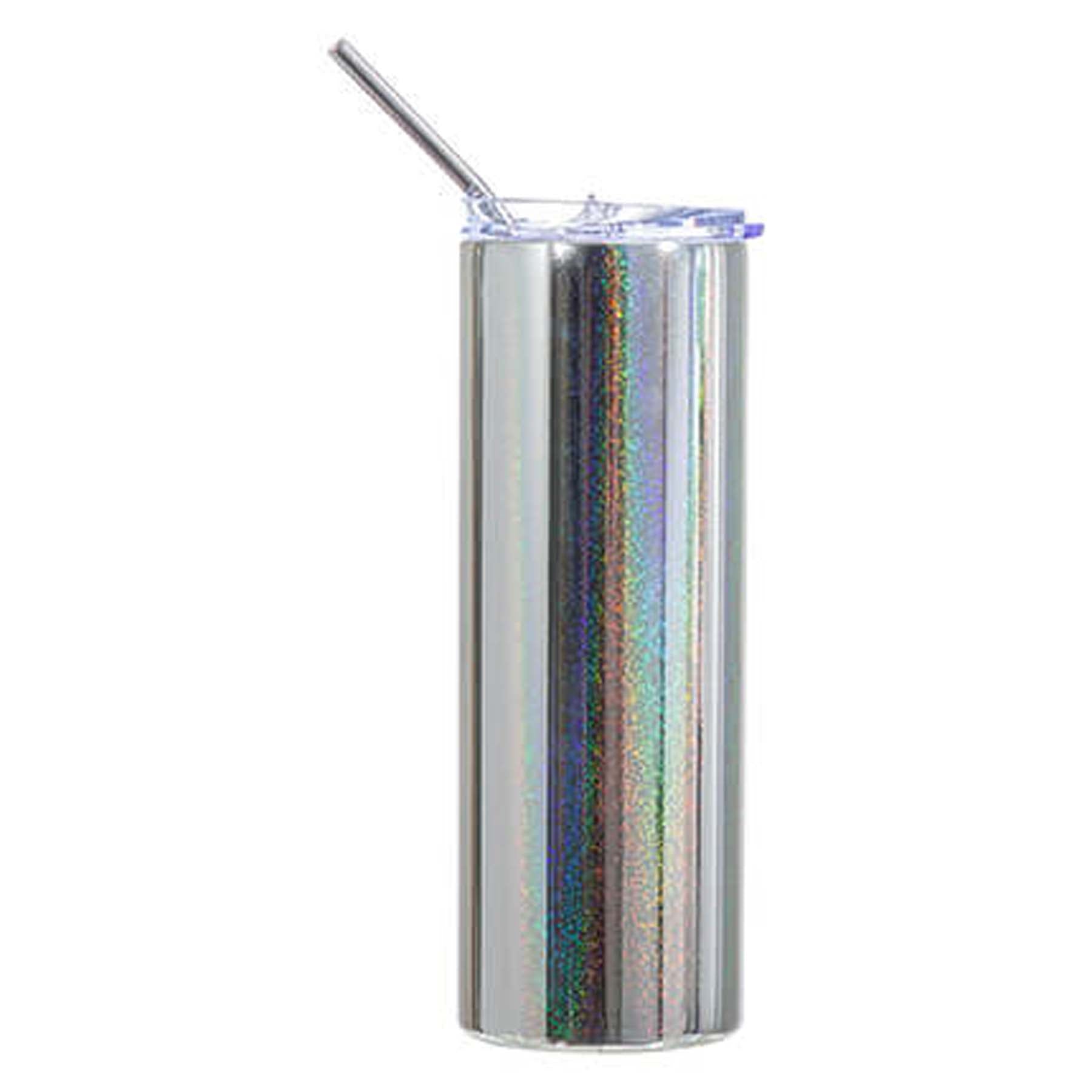 Edelstahl-Becher mit Strohhalm - 600 ml - Metallic-Silber mit Glitzer