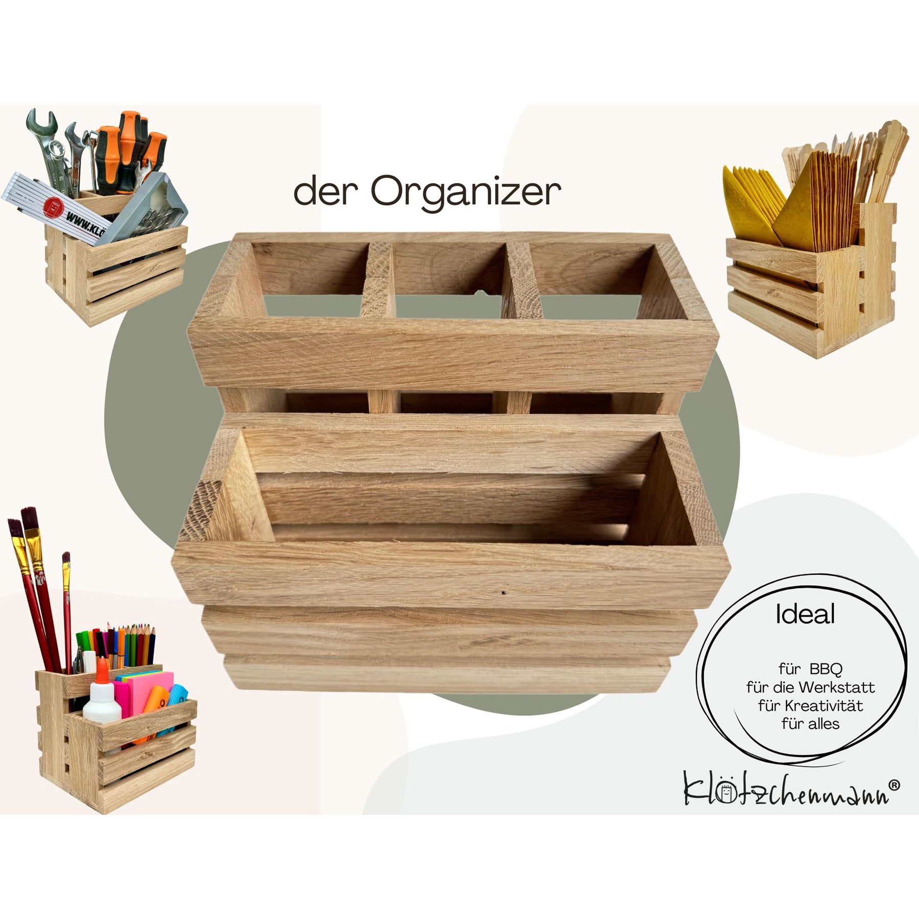 Das „Allrounder Set vom Klötzchenmann“ beinhaltet kreative Projekte, die sowohl praktisch als auch dekorativ sind. Es bietet die Möglichkeit einen Organizer, einen Untersetzer und einen Korb zu gestalten, was es zu einem vielseitigen Set macht, das in vielen Bereichen des Hauses nützlich sein kann.